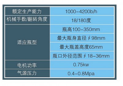 本產(chǎn)品自動(dòng)化程度高,節(jié)省人工:機(jī)械手工作穩(wěn)定可靠,產(chǎn)品檢驗(yàn)簡單明了:翻轉(zhuǎn)導(dǎo)軌與機(jī)械手同步協(xié)調(diào),增大了瓶高適應(yīng)范圍。